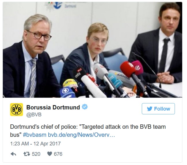 Prije nje je predsjednik policijske uprave Dortmunda Gregor Lange rekao kako se radi o ciljanom napadu na igrače Dortmunda.