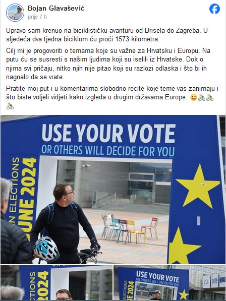Kandidat SDP-a na listi za Europski parlament Bojan Glavašević u okviru svoje predizborne kampanje krenuo je jutros na put biciklom iz Bruxellesa do Zagreba, kamo bi trebao stići za dva tjedna.