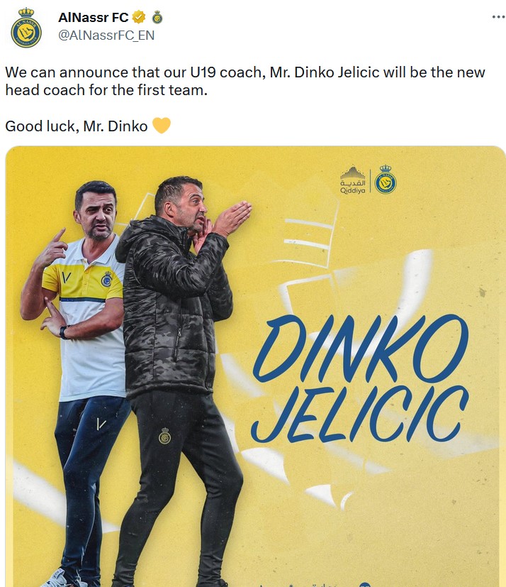 Saudijski klub Al-Nassr, u kojem igra portugalska superzvijezda Cristiano Ronaldo, objavio je u četvrtak raskid ugovora od francuskog trenera Rudija Garcije, a novi trener je Hrvat Dinko Jeličić.