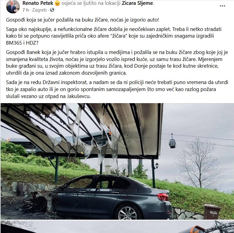 “Gospođa Banek koja je jučer hrabro istupila u medijima vezano uz buku žičare zbog koje joj se smanjena kvaliteta života, noćas je izgorjelo vozilo ispred kuće, uz samu trasu žičare. Mjerenjem buke građani su u svojim objektima uz trasu žičara, kod Donje postaje te kod kutne skretnice utvrdili su da je ona iznad zakonom dozvoljenih granica”, objavio je na Facebooku Petek.