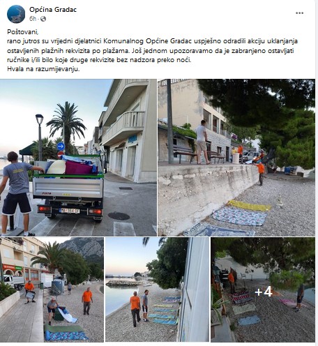 “Rano jutros su vrijedni djelatnici Komunalnog Općine Gradac uspješno odradili akciju uklanjanja ostavljenih plažnih rekvizita po plažama. Još jednom upozoravamo da je zabranjeno ostavljati ručnike i/ili bilo koje druge rekvizite bez nadzora preko noći”, objavili su.