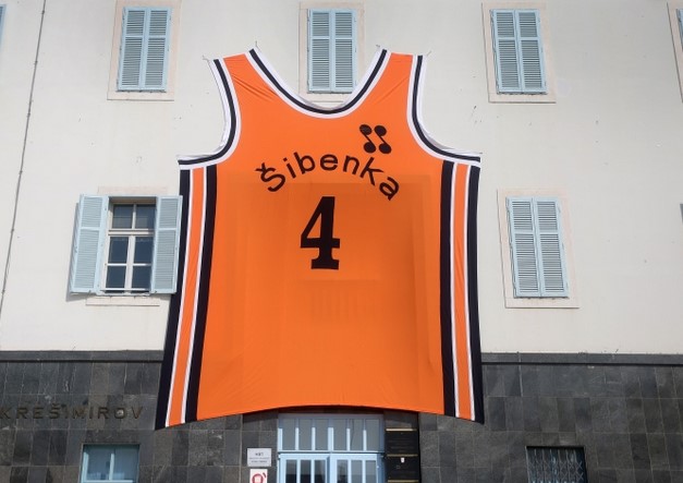 Na zgradi gradske uprave u Šibeniku jučer je postavljen dres Dražena Petrovića, dimenzija 5×7 metara, a dizajnirala ga je i sašila Karmen Herceg povodom njegova 55. rođendana.