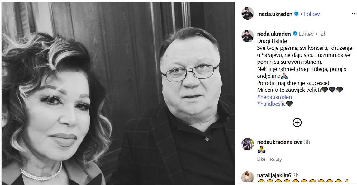 Neda Ukraden oprostila se od Halida Bešlića emotivnom porukom na Instagramu. Napisala je da joj srce i razum ne mogu prihvatiti surovu istinu o njegovom odlasku