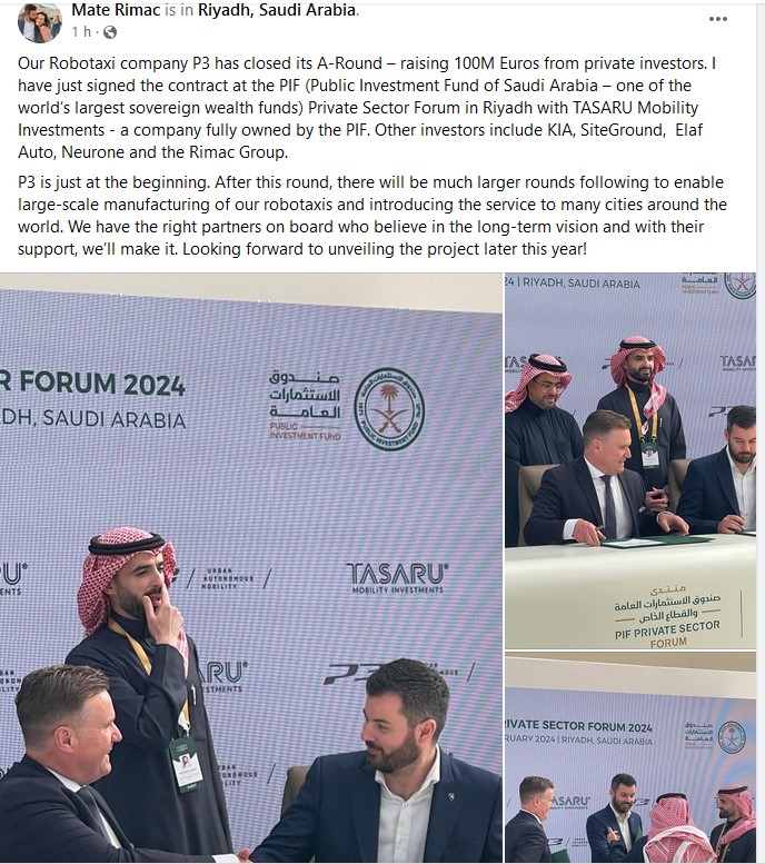 U priopćenju stoji kako je Project 3 Mobility u ovoj investicijskoj rundi privukao istaknute globalne kompanije i investitore pa je, navodi se, u tu hrvatsku kompaniju investirao jedan od najvećih investicijskih fondova na svijetu Public Investment Fund (PIF) iz Saudijske Arabije, kojem je to prva investicija u Hrvatskoj. PIF je u vlasničku strukturu Project 3 Mobilityja ušao kroz svoju investicijsku kompaniju TASARU Mobility Investments, koja ulaže u pametna i održiva rješenja mobilnosti.