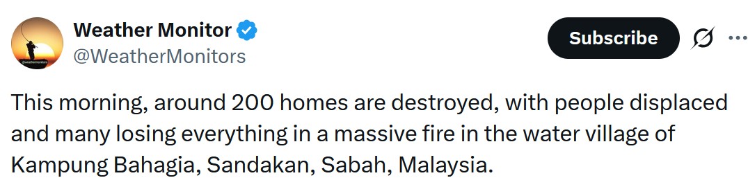 Požar je izbio u jednom od sela Sabaha sa sojenicama i dom su nekim od najsiromašnijih zajednica u zemlji, uključujući mnoge apatride i autohtone skupine, piše Reuters.